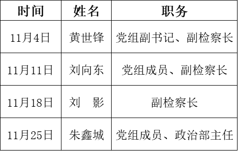 为深入贯彻落实《信访工作条例》,巩固深化群众信访“件件有回复”制度,畅通群众诉求渠道,提高控告申诉检察工作质效,现将寻乌县人民检察院2025年11月检察长接访安排公布如下: